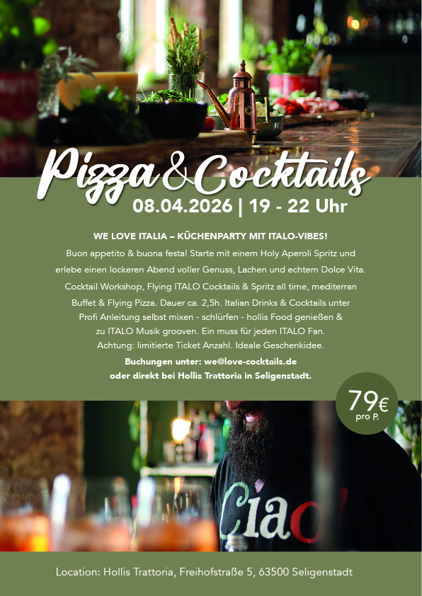Buchungen unter: we@love-cocktails.de oder direkt bei Hollis Trattoria in Selingenstadt.